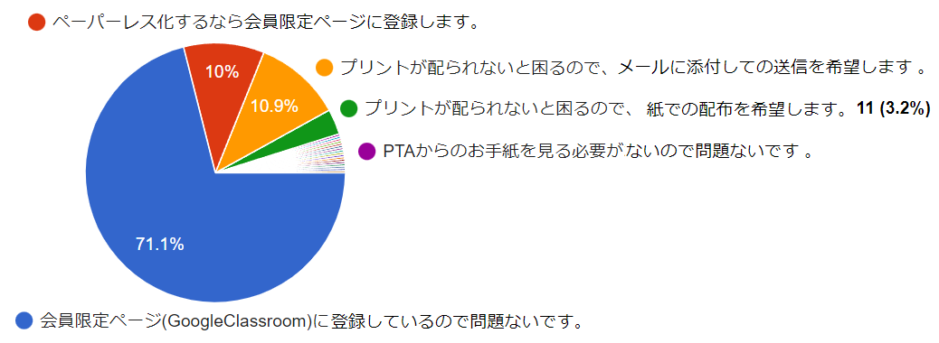 - PTAの業務をスリム化するためにも環境のためにもペーパーレス化は素晴らしいと思います。が、全員がアクセスできるとは限らないので出来れば両方あると助かります。でもPTAとしては業務が増えて大変ですよね。
